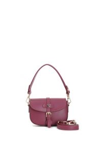 leather flap with short shoulder strap, loop with enamelled rivet and buckle purple