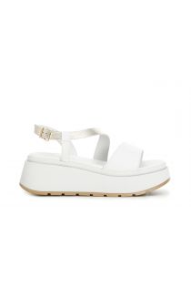 Two-tone leather sandals with asymmetrical strap on wedge.