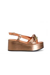 Two-tone leather laminated sandals on wedge with chain accessory.