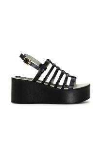 Leather sandals with high wedge and flat band with cage effect