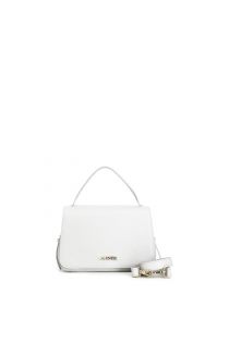 Medium-sized leather satchel with long flap to be carried by hand or with optional shoulder strap.