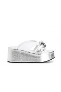 Two-tone leather laminated slides on wedge with chain accessory.