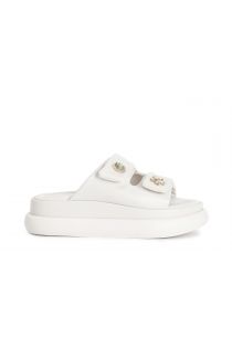 Two-band leather slipper with velcro and jewel buttons. the lining and insole are in leather. the wedge is 4.5 cm high. perfect footwear for every situation. ideal for your beach adventures but also for a walk in the city. perfect combination between elegance and practicality.