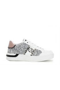 Leather sneakers with glitter inserts. Metal logo on the side with box sole and metallic insert.