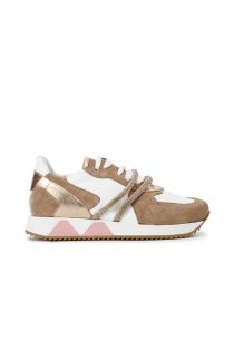 Leather sneakers with a rounded sole characterised by an interplay of multi-material inserts in powdery nuances. rhinestone details encircling the upper.
