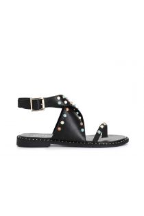 Thong sandals with crossed leather band with cabochon. lining and insole are in leather. the heel is 2 cm high. comfortable to wear and easy to match.