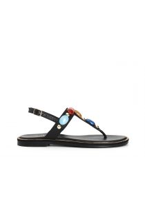 Leather thong sandals with decorated stones. lining and insole are in leather. shoe with a slightly rounded shape. the heel is 2.5 cm.