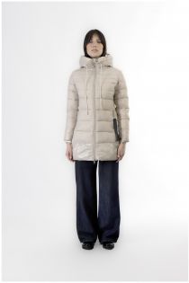 Down jacket with fixed hood made of superlight fabric with contrasting shiny/matt finishes. knee length. versatile and practical an essential item in the wardrobe of the new autumn winter season.