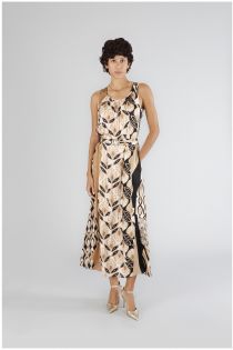 Long dress with shoulder straps and side pockets. sash with logo. all made in an exclusive scarf print and available in two color variations. a garment suitable for day and evening.