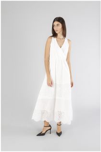 Long sleeveless dress with criss-cross neckline made of cotton poplin with ruffles in broderie anglaise fabric. dress with a romantic and feminine style.