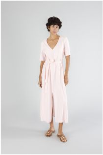 Long dress with sash and elbow-length sleeves. "v" neckline and slit on the front made of a fresh mixed fabric. wear it with sandals to make your look casual and unique.
