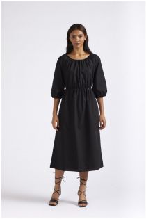Long dress with wide raglan sleeves made of cotton poplin. the neckline at the back is original. ruffle play at the sleeves and neckline.