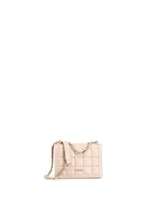 Long flap satchel with checkered quilting embellished with small pyramid studs at the corners chain handle and chain shoulder strap with threading.