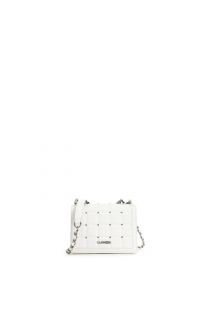 Long flap satchel with checkered quilting embellished with small pyramid studs at the corners chain handle and chain shoulder strap with threading.