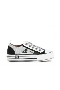 Low patchwork effect fabric sneakers with rubber sole featuring coloured inserts.