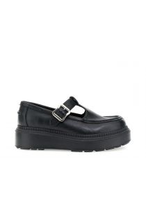 Brushed faux leather Mary Jane loafers with a side buckle and a 35cm studded sole. Leather insole. Schoolgirl style and bold attitude for every look.