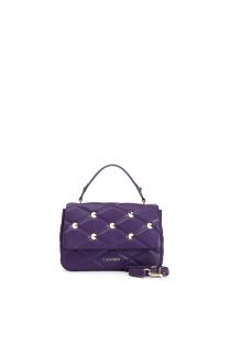 Medium bag with quilted flap with hexagonal studs and embossed logo. bag with a single compartment an inside zipped pocket a mobile phone pocket and a shoulder strap. magnet closing.