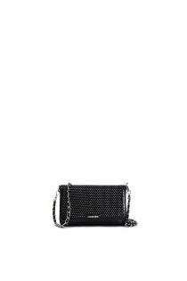 Patent-effect mesh and rhinestone clutch bag. shoulder strap with removable threading chain. magnetic clasp.