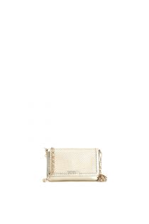 Patent-effect mesh and rhinestone clutch bag. shoulder strap with removable threading chain. magnetic clasp.