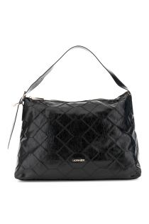 Soft faux leather bag with a metallic leather effect and geometric embroidery on the front and back. Adjustable handle with buckle, removable shoulder strap, and metal logo.