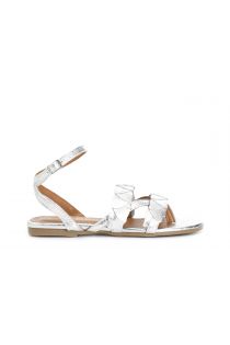 Low leather sandals with double strap gilda model and ankle strap. two-tone front decoration resembling interwoven leaves.