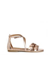 Low laminated leather sandals closed at the back and with a double strap that criss crosses and ties at the ankle. front decoration resembling interwoven leaves.