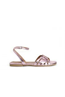 Laminated leather low sandals with ankle strap and front decoration resembling interwoven leaves.