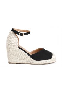 Microfibre sandals on 10.5 cm rope wedge and 3.5 cm platform. ankle strap. leather insole. shoe closed at the front and back. golden studs on the top and on the strap.