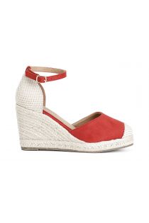 Microfibre sandals on 10.5 cm rope wedge and 3.5 cm platform. ankle strap. leather insole. shoe closed at the front and back. golden studs on the top and on the strap.