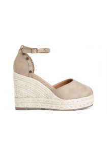 Microfibre sandals on 10.5 cm rope wedge and 3.5 cm platform. ankle strap. leather insole. shoe closed at the front and back. golden studs on the top and on the strap.