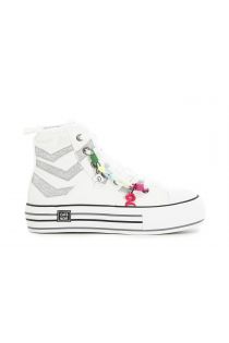 Mid sneakers made of fabric and glitter enriched with a colourful removable accessory.