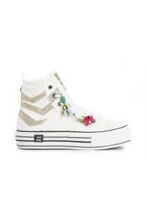 Mid sneakers made of fabric and glitter enriched with a colourful removable accessory.