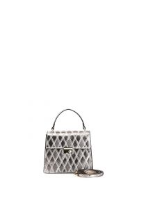 Rigid minibag in metallic colours. diamond shaped patchwork. single compartment and zipped inner pocket. snap fastener with rhinestone accessory. bag with shoulder strap.