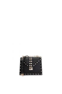 Mini bag with chain to be slung over the shoulder speckled with rhinestones and studs. The closure also features a large rhinestone and laser logo