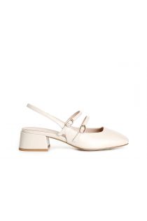 Woven laminate slingback with ankle strap. leather insole. shoe with a rounded shape. a mix between a moccasin and a pump. elastic strap on the back. wide heel h. 4 cm. very comfortable perfect for everyday use.