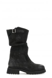 Nubuck tube ankle boots with soft pleats and an ankle strap. They feature a leather insole, a lug sole, and a 5.5 cm heel. A bold style for a contemporary urban look.
