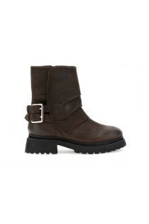 Nubuck ankle boots with a cuff and double side buckle. Leather insole for maximum comfort. 5.5 cm heel and lug sole. Bold, urban style.