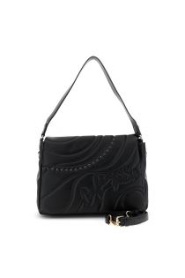 Quilted and padded faux leather flap bag with decorative rivets. Short shoulder strap and removable shoulder strap with metal snap hooks.