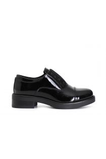 Patent leatherette ladies' oxford brogues with central stretch panel and studs. the insole is leather.
