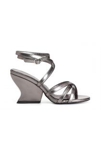 Patent gladiator sandals with three front bands and crossover instep. adjustable buckle strap at the ankle. the 80mm-high wedge heel is original and comfortable.