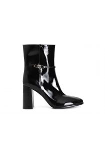 Women's patent leather ankle boot with strap and personalized accessory. 88 mm square heel. the insole is in leather. very versatile and chic shoe to interpret office and leisure looks with style.