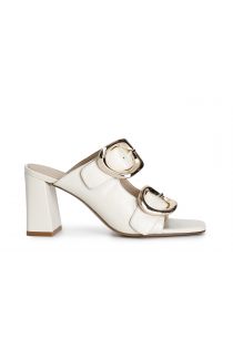 Patent leather slipper with double buckle. upper lining and insole are in leather. 8.5 cm high wide heel. elegant stylish and formal shoe.