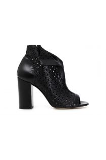 Perforated leather open toe ankle boots. The thin metal thread inserted in the hem of the front upper makes a dual fit possible by folding the ends forward. The metal logo is visible or closed on the décolleté according to how it is worn.