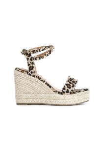 Printed canvas sandals on a cord wedge and platform. ankle strap with gold studs.