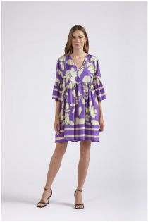 Comfortable fit dress with ruched waist and wide sleeves. made of printed viscose fabric.