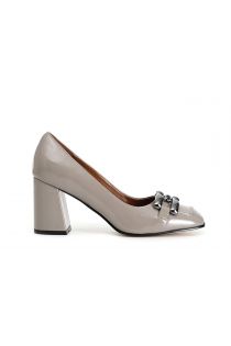 Glamorous court shoe with square toe enriched with metal horsebit. 75mm wide heel. leather insole. perfect footwear for all occasions