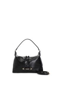 Bag in croco print synthetic material. application of tags with metal lettering. zipper closure. internal zip pocket. removable shoulder strap.