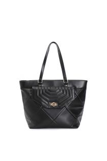 Quilted shopping bag with diamond pattern. front pocket with quilted flap with striped pattern and personalized metal closure. zipper closure