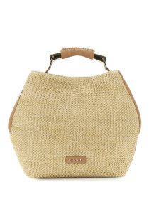 Woven raffia bag with contrasting leather-effect trim a front lettering patch and a metal handle with a threaded strap. spacious and lightweight it's perfect for casual summer looks and vacations. dimensions: 48 cm (length) × 35 cm (height) × 12 cm (depth)