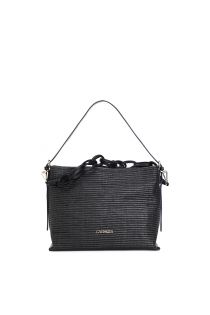 Raffia boho bag with handle locked by metal buckles at the sides and enriched with a chain made of soft material.